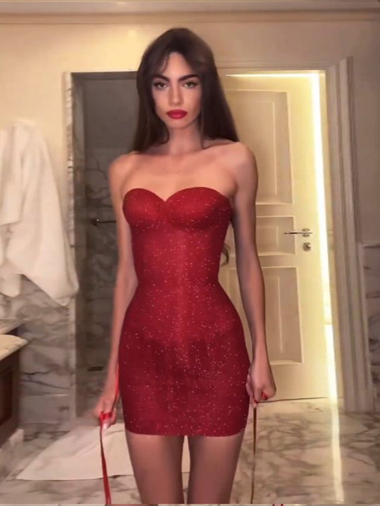 Shine at any party with this red glitter tube top short dress for women. Featuring a slim-fit mini silhouette and sparkling glitter finish, this dress combines modern European and American-inspired style with chic elegance. The strapless tube top highlights the neckline and shoulders, while the soft, high-quality fabric ensures comfort and ease of movement. Perfect for parties, evening outings, or festive occasions, this versatile mini dress offers a polished, stylish look suitable for any celebration.